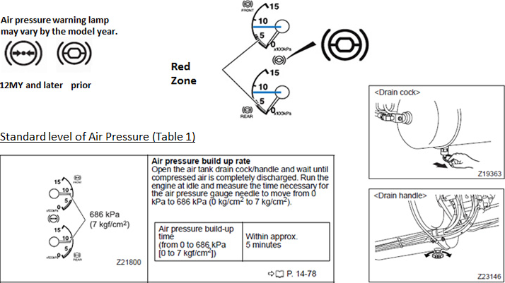 Below are representative examples related to low air pressure. Please make use of these examples and check the air pressure gauge in the instrument panel and measure the time of air pressure build-up at all times in your daily operation for your safety and comfort.